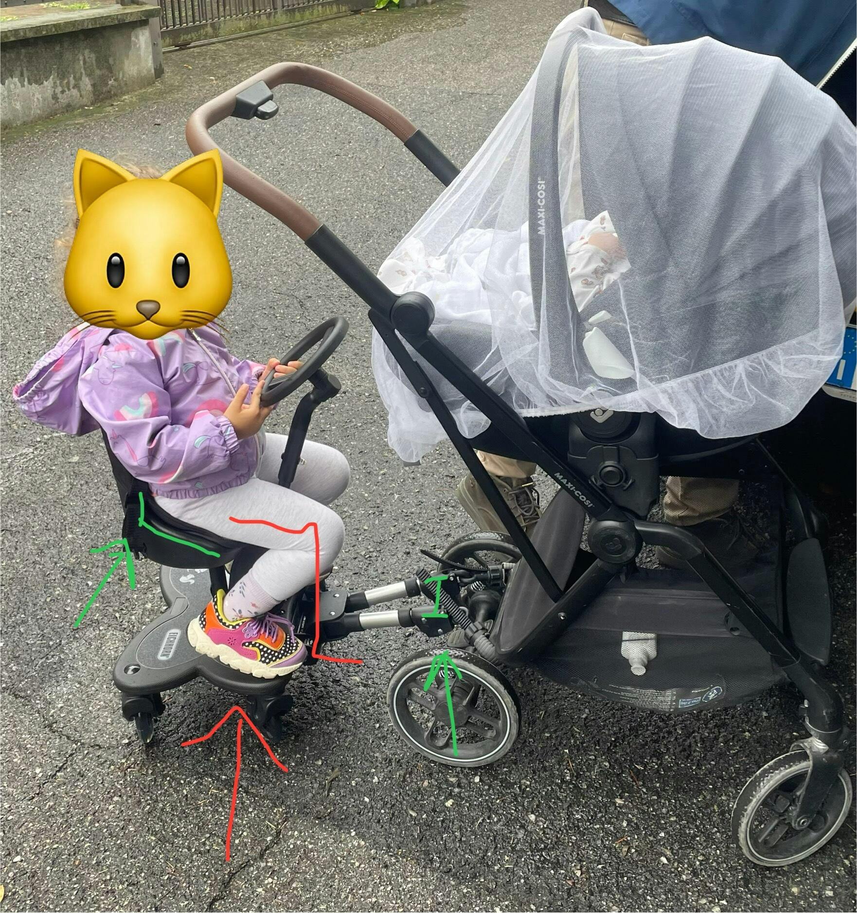 Bella pedana, molto solida. Il fatto che il perno per il seggiolino sia al centro della pedana, fa sì che ci sia poco spazio per i piedi (rispetto al modello precedente con seduta sul bordo posteriore). Altro lato negativo le aste per collegarsi al seggiolino si muovono, ruotando i ganci sul passeggino, quindi quando le aste si avvicinano la pedana bascula a destra e sinistra. Ultima cosa forse il seggiolino poteva essere un po’ più grande. Detto ciò è molto utile, quindi 4 stelle!